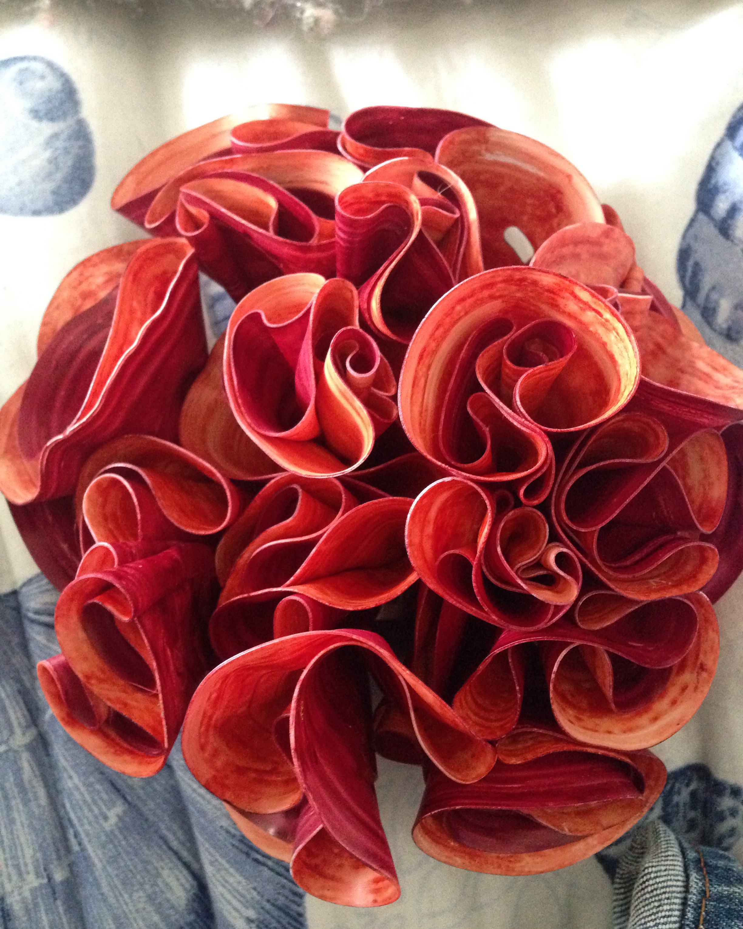 As Mariana’s collection of small Temari grew, she began to find ways of assembling them together to create large pieces. Her current body of work involves using hundreds of wrapped forms to create one unified piece. Some of her work explores the idea of dark matter, while other compositions focus mostly on color and shape. She is also using a large collection of plastic coffee cup lids, melting them into flower like sculptures.