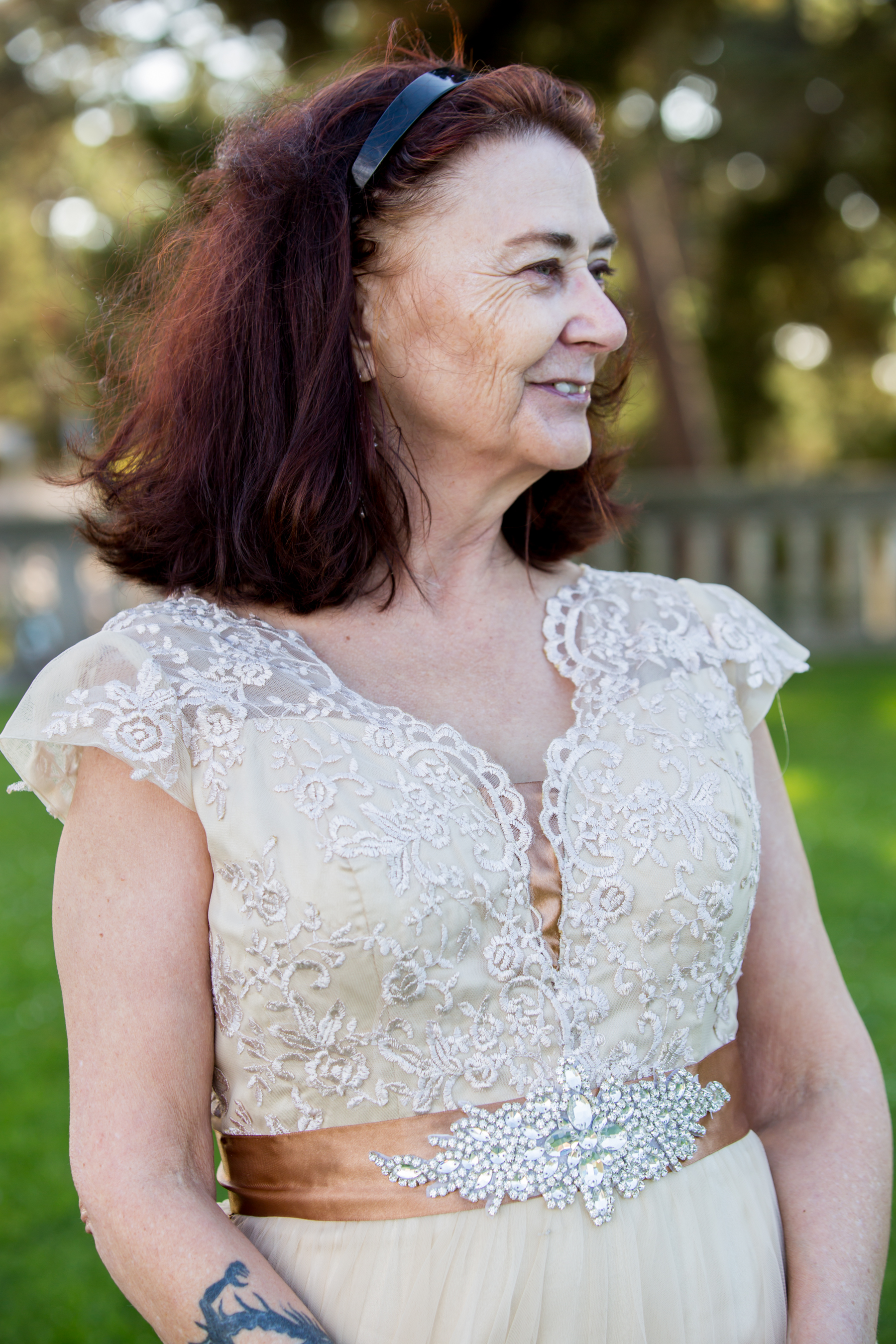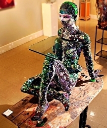 Connie’s mosaic adventure crossed over from furniture to mannequins when she was given a dancing figure and decided it was the perfect platform for expressing the frustrations of the transition through menopause. Her creations include a variety of glass, mirror and found objects in strong colors representing feelings involved with women’s issues, death and life transition, and the women who are currently or in the past have been an important part of her life.