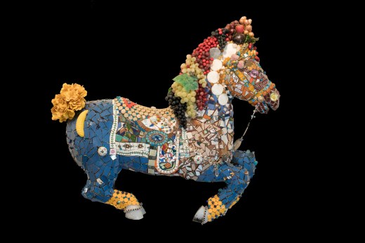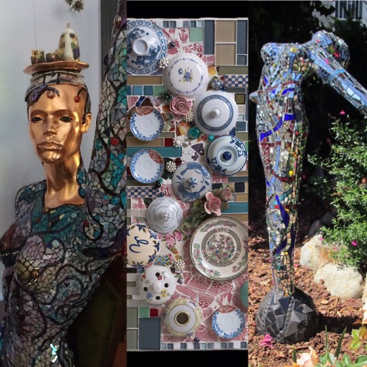 The reflective qualities of the glass force the viewer to move around the piece to see it truly take shape and reveal itself. The recycled china, tiles and found objects create an intimacy with the viewer when recognizable things are used in new ways. “Mosaic art is not a static medium. The play of light adds an extra dimension one doesn’t find in many other art forms.”