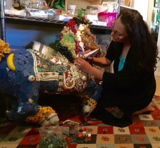 “I find mosaics to be crazy-making! At times I have to admit I walk that fine line between sanity and insanity because each cut, each piece, each color, each placement has to be perfect! Specifically, I like to work with sparkly, mirrored, textured, brightly_colored glass, recycled glass and found objects. I feel like I am painting with light.”