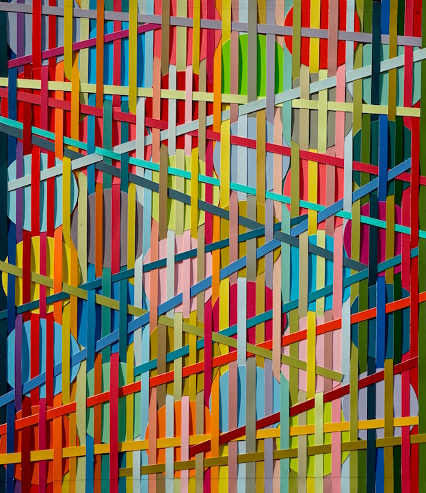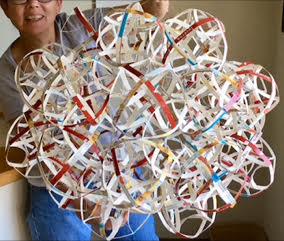 From A family of makers, Aiko Cuneo worked with teachers, students and families as a teaching artist in San Francisco schools. She combines a variety of materials to make two and three-dimensional constructions. SCRAP, the Scrounger’s Center for Reusable Art Parts, has been an ongoing source of materials that inspire Cuneo’s work. Her work for this show is made with paper, security envelopes, bar codes, buttons, sewing notions, milk cartons, 45 rpm records and paint swatches. “The art of making something from someone else’s discards is food for my soul as it brings joy and satisfaction from the challenges of transformation.”