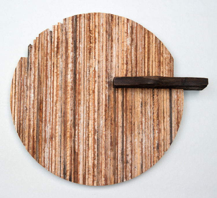 Most recently, she is constructing sculpture incorporating reclaimed cardboard and decaying materials. The sequence is created from common, everyday materials including withered wood, discarded cardboard and rusted metal work. Hyde scavenges from city streets, generous building contractors and reuse yards. She carefully pieces the object together, rather like completing a puzzle.