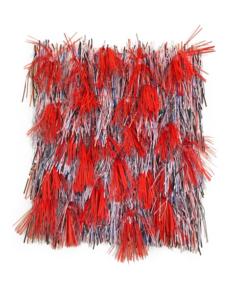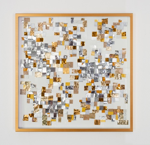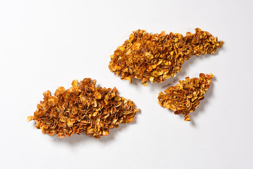 Through various arrangements and repetitions, the organic forms, shapes, and patterns of “Mylar Reveries” reveal the hidden elegance of reclaimed debris used as a medium, in large as a much-needed reminder of environmental awareness. The ultimate goal of this on-going body of work is to divert the refuse, such as single-use foil lined packagings from landfill and recast into graceful topographies that echo and reflect nature, landscapes, and horizons.