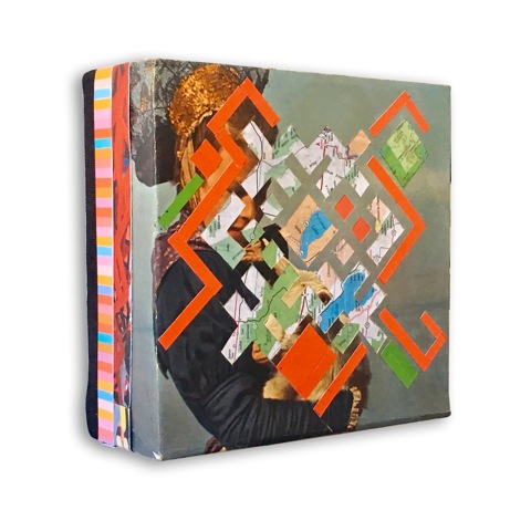“Chaos/Crisis” are works made during a dark period in Kevin’s life. However, the works are not dark at all. The use of clashing colors and mixed patterns are used to portray the disruption of his life at that time. “Road Trip” series was inspired by finding a box of road maps in a neighbor’s recycling bin. The soft greens and blues in the maps play with the bolder colors he already works with. Kevin also works with other scavenged paper, print trimmings and fabrics.