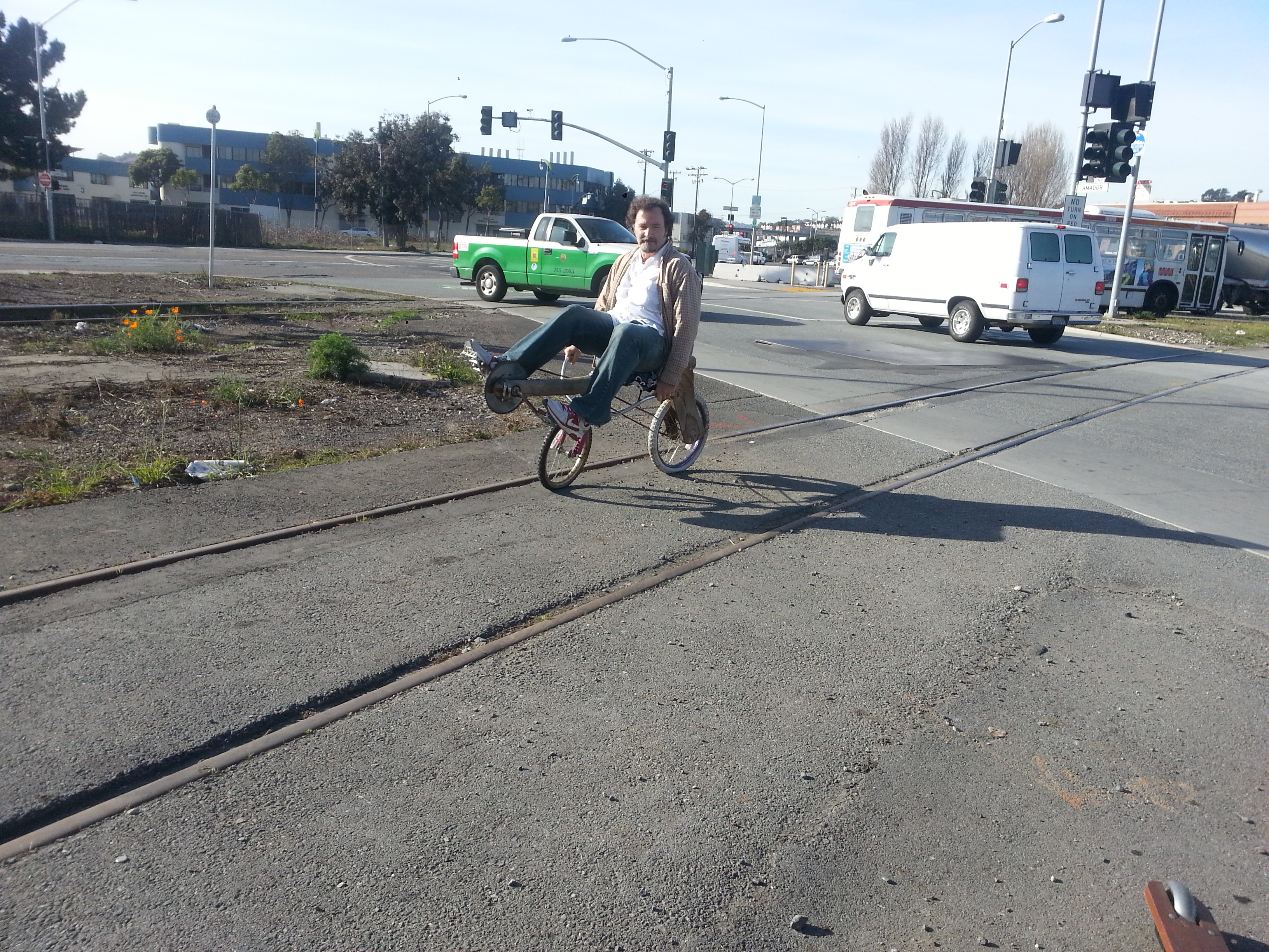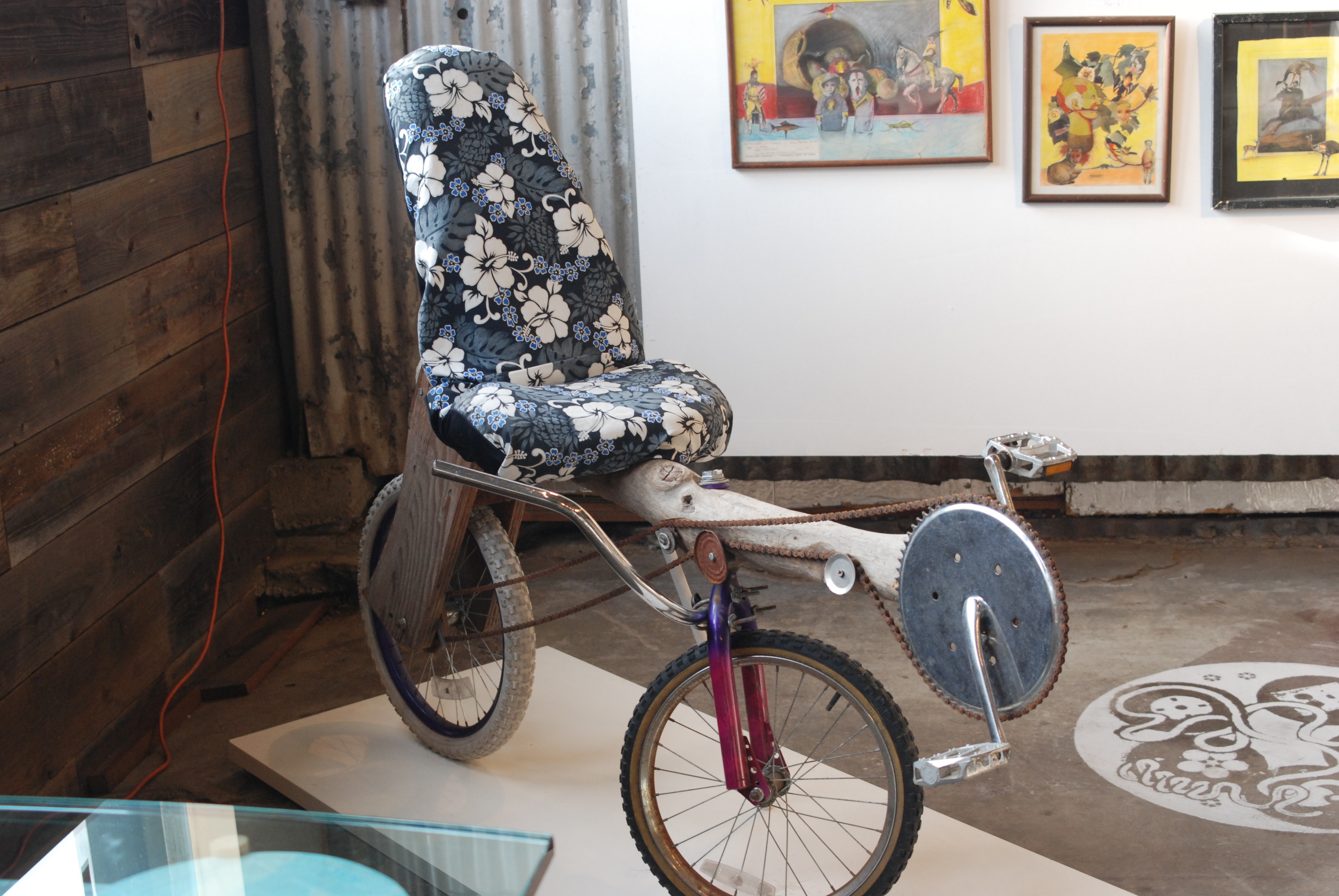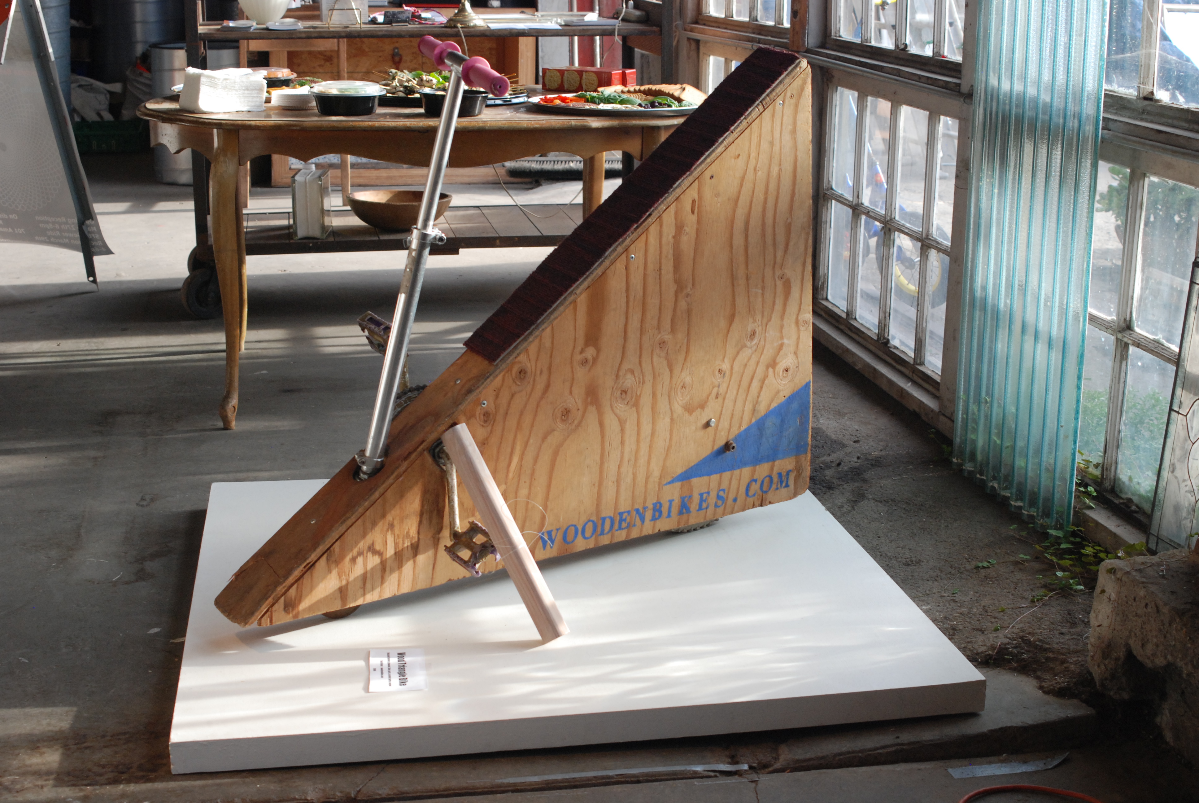 Check Out Beneath The Surface artists testing the work of featured artist Tom Kabat at a recent planning meeting! Kabat fashions interesting and intuitive bicycle sculptures from reclaimed odds and ends including skis, scooters and even a pencil bike that actually writes!! You can see more of his work at http://www.woodenbikes.com